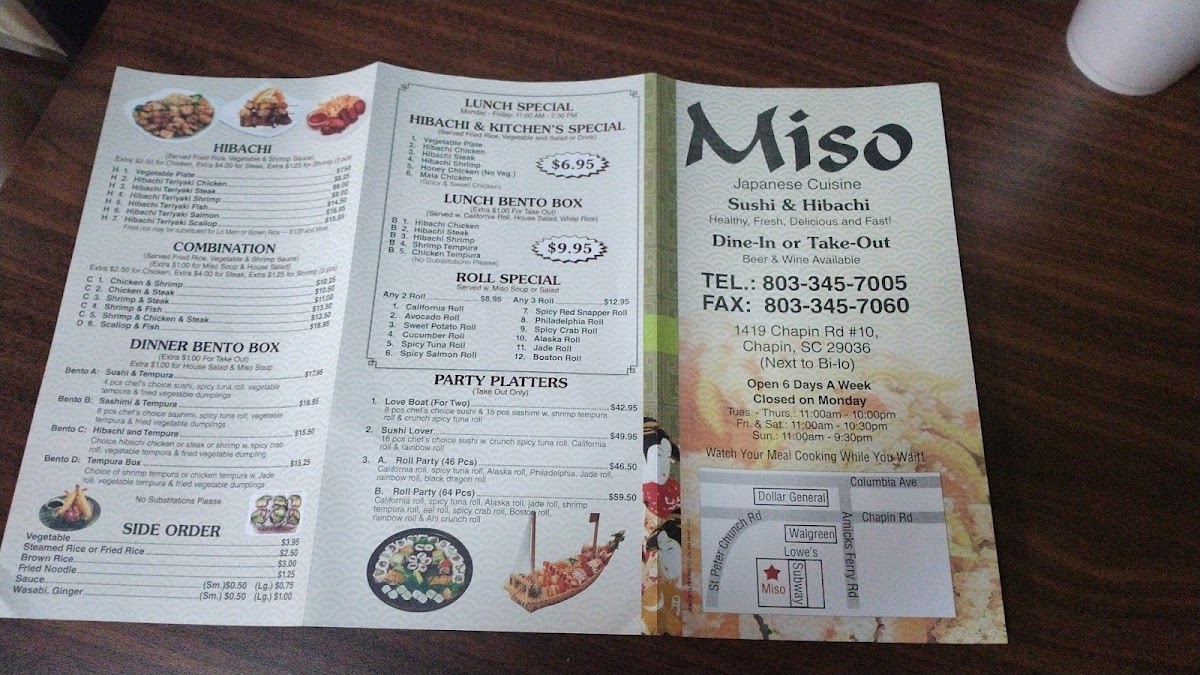 Miso Japanese Restaurant Chapin is a delightful culinary haven located at 1419 Chapin Rd, Chapin, SC. Known for its fresh and flavorful offerings, this hidden gem specializes in hibachi and sushi, making it a must-visit for Japanese cuisine lovers. Customers rave about the well-portioned dishes, with highlights including the chicken hibachi and an array of exquisite Maki rolls. The restaurant’s inviting atmosphere and attentive service enhance the dining experience, ensuring your meal is not just enjoyable but memorable. With reasonable prices and consistently high-quality food, Miso is truly a standout destination in the Chapin area.